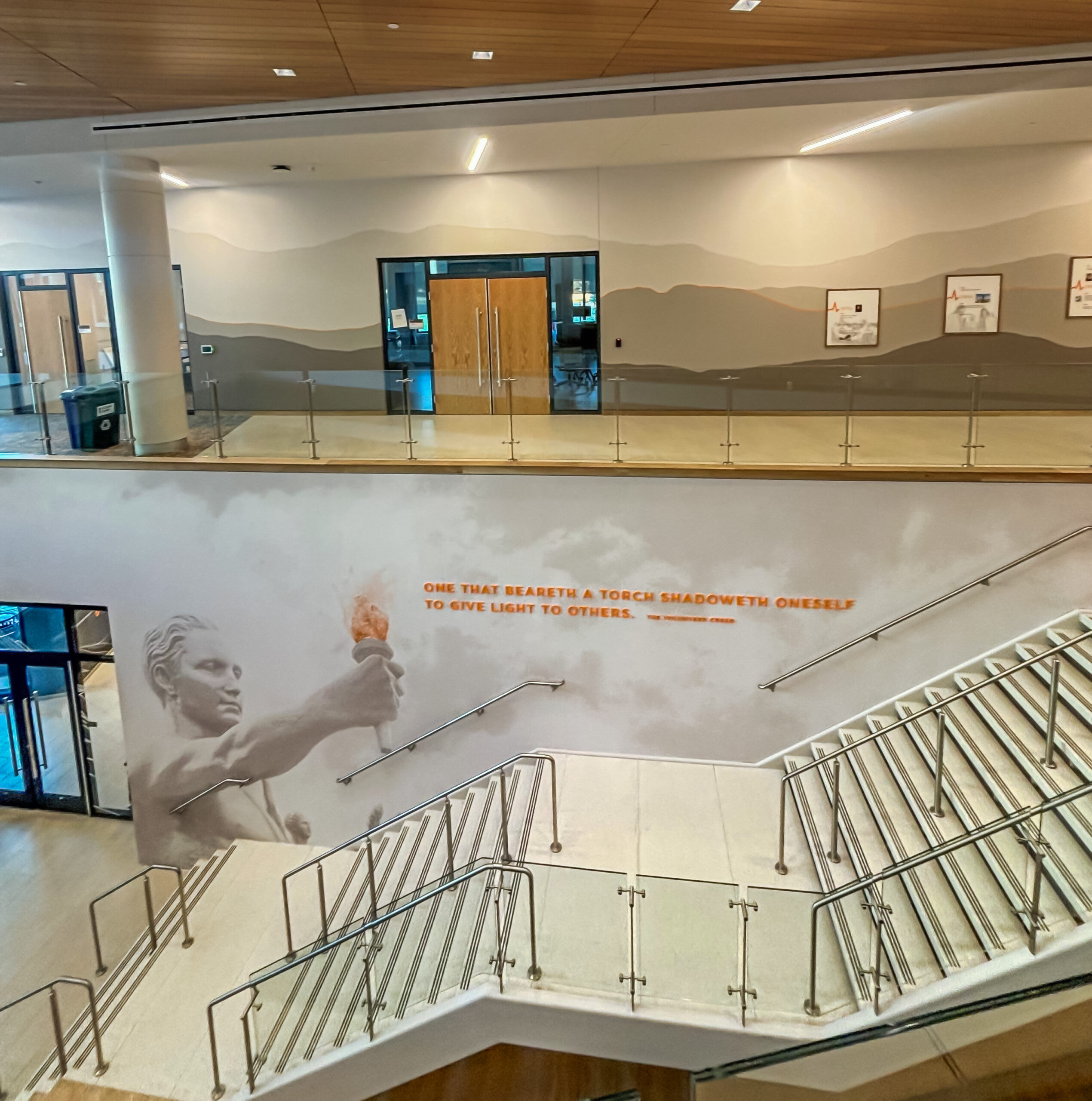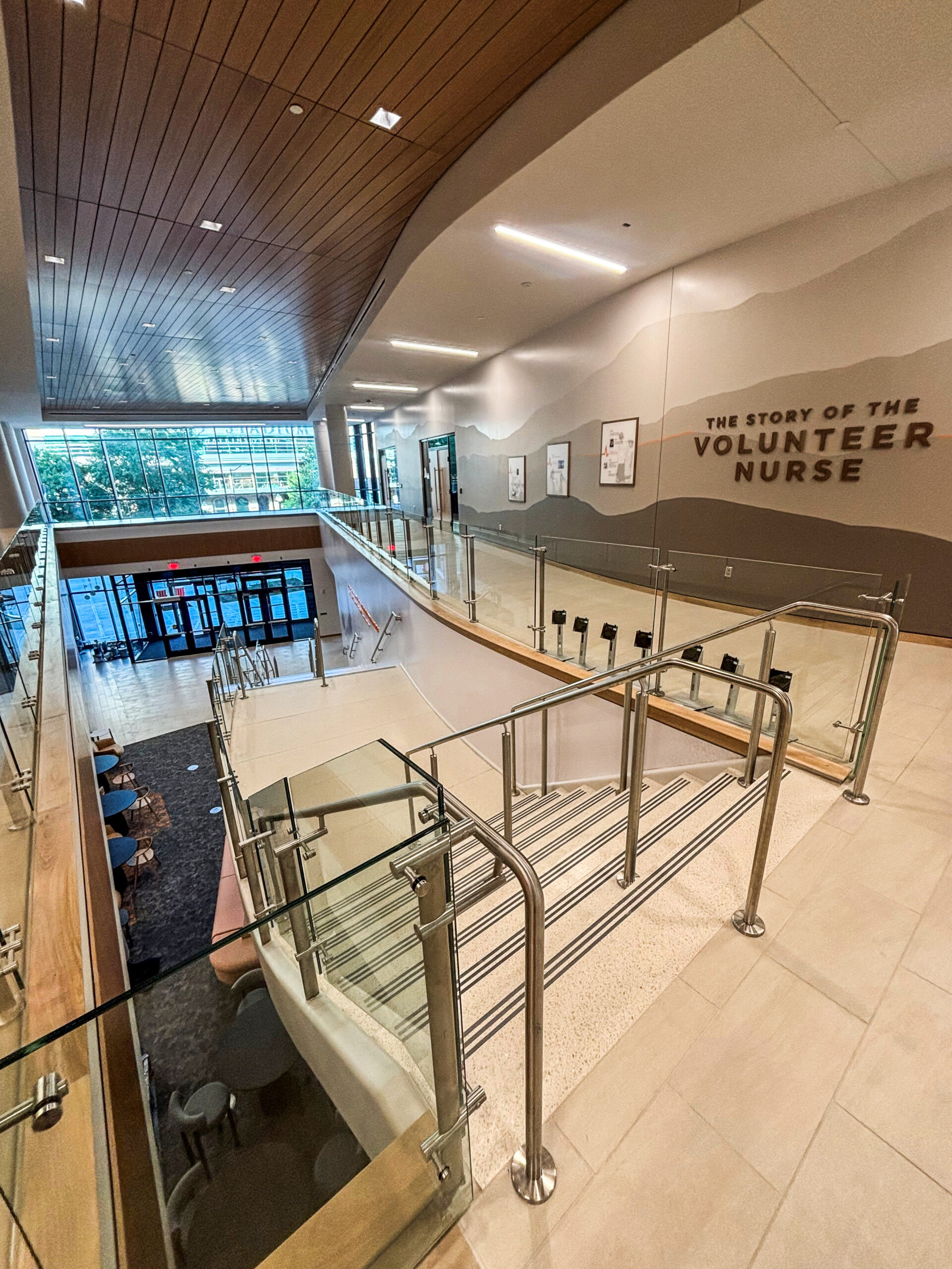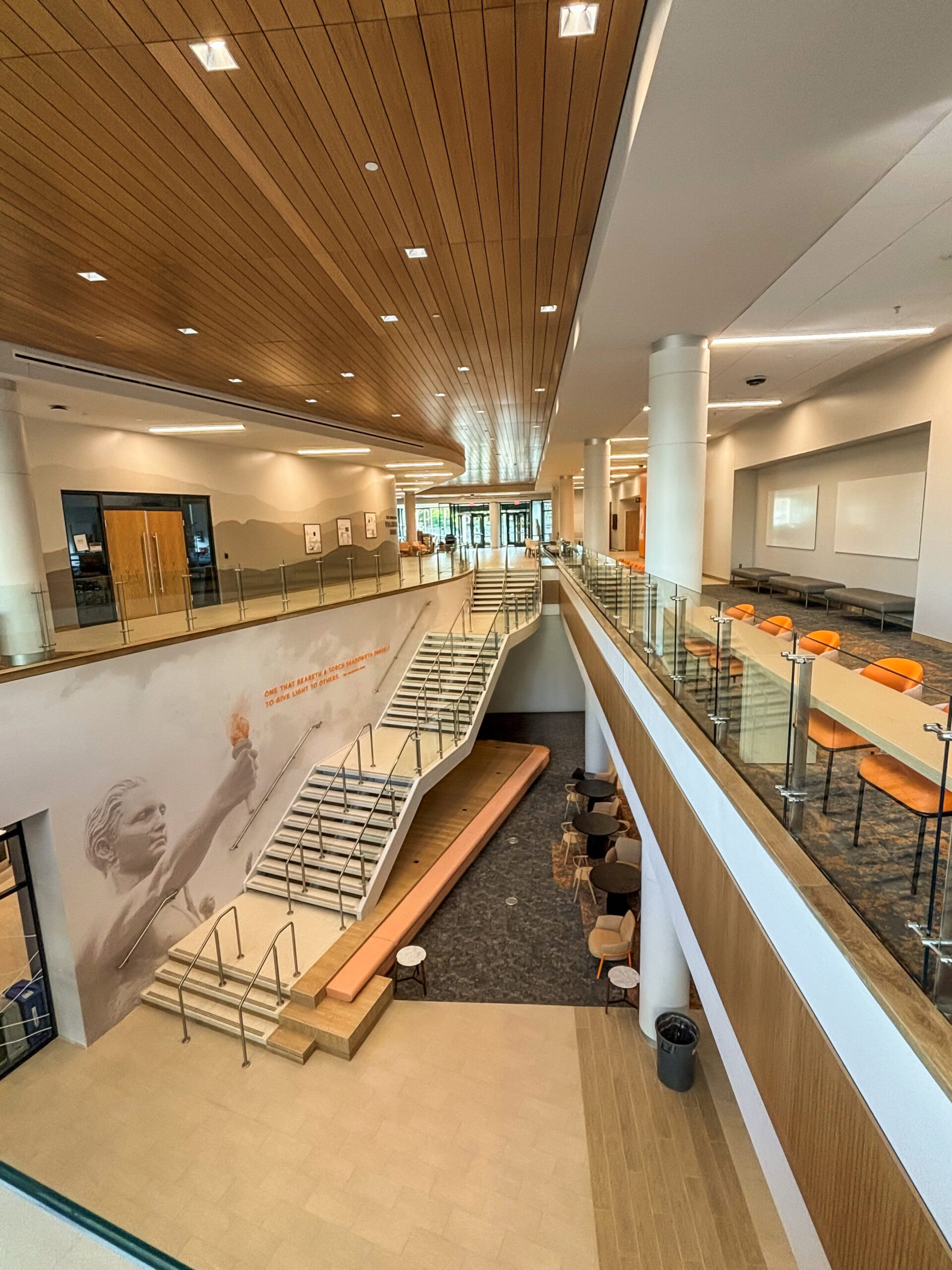 Whether ascending the main staircase or observing from the second-floor overlook, students and faculty experience a railing system that prioritizes safety.