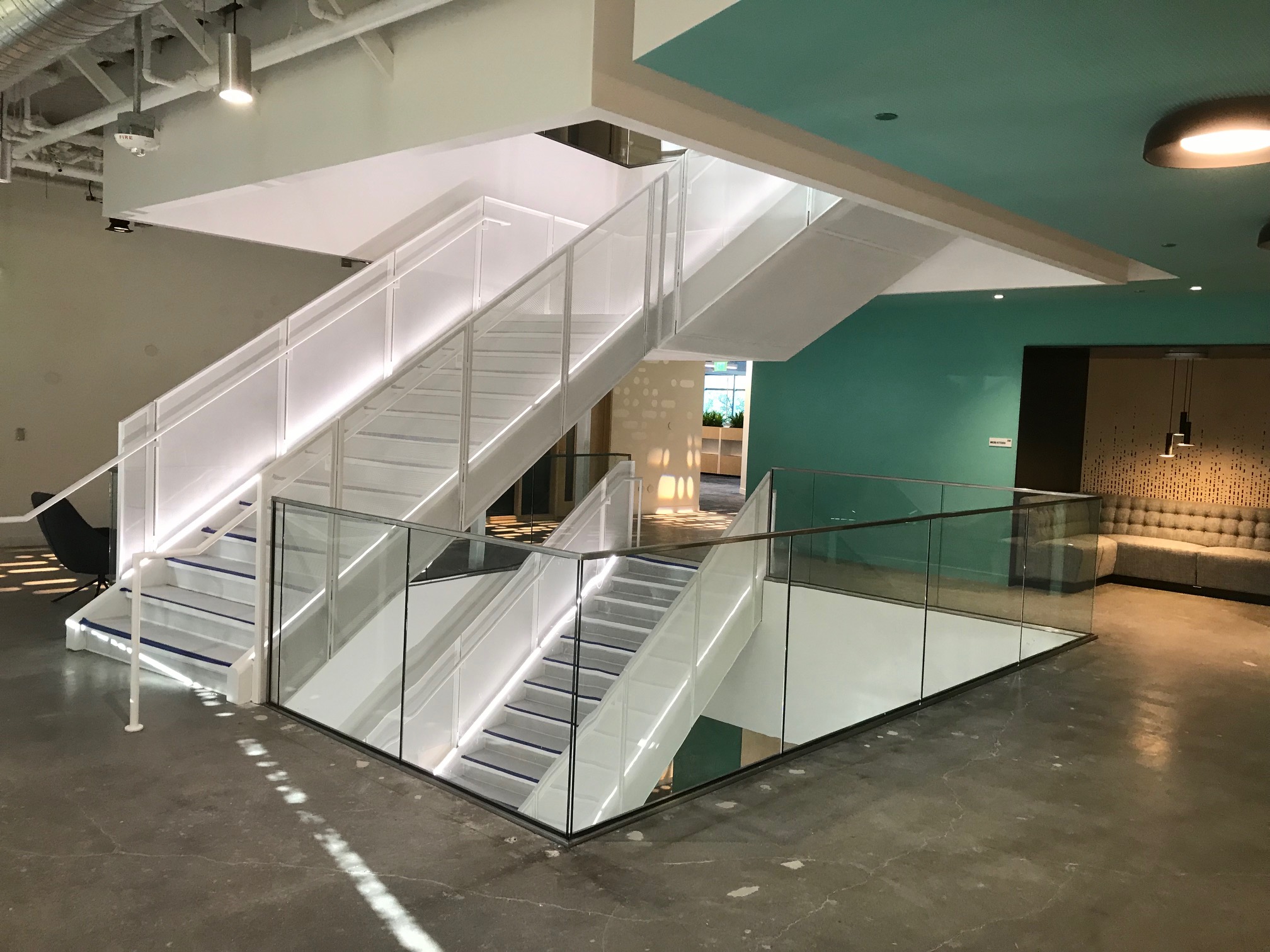 Tempered 1/2″ (13 mm) thickness glass was chosen as the infill material at Google’s headquarters. A custom cap-rail design continues the flowing glass design. Minimized to 1” by 1,” the cap meets safety requirements without disrupting the infill’s continuous plane appeal.