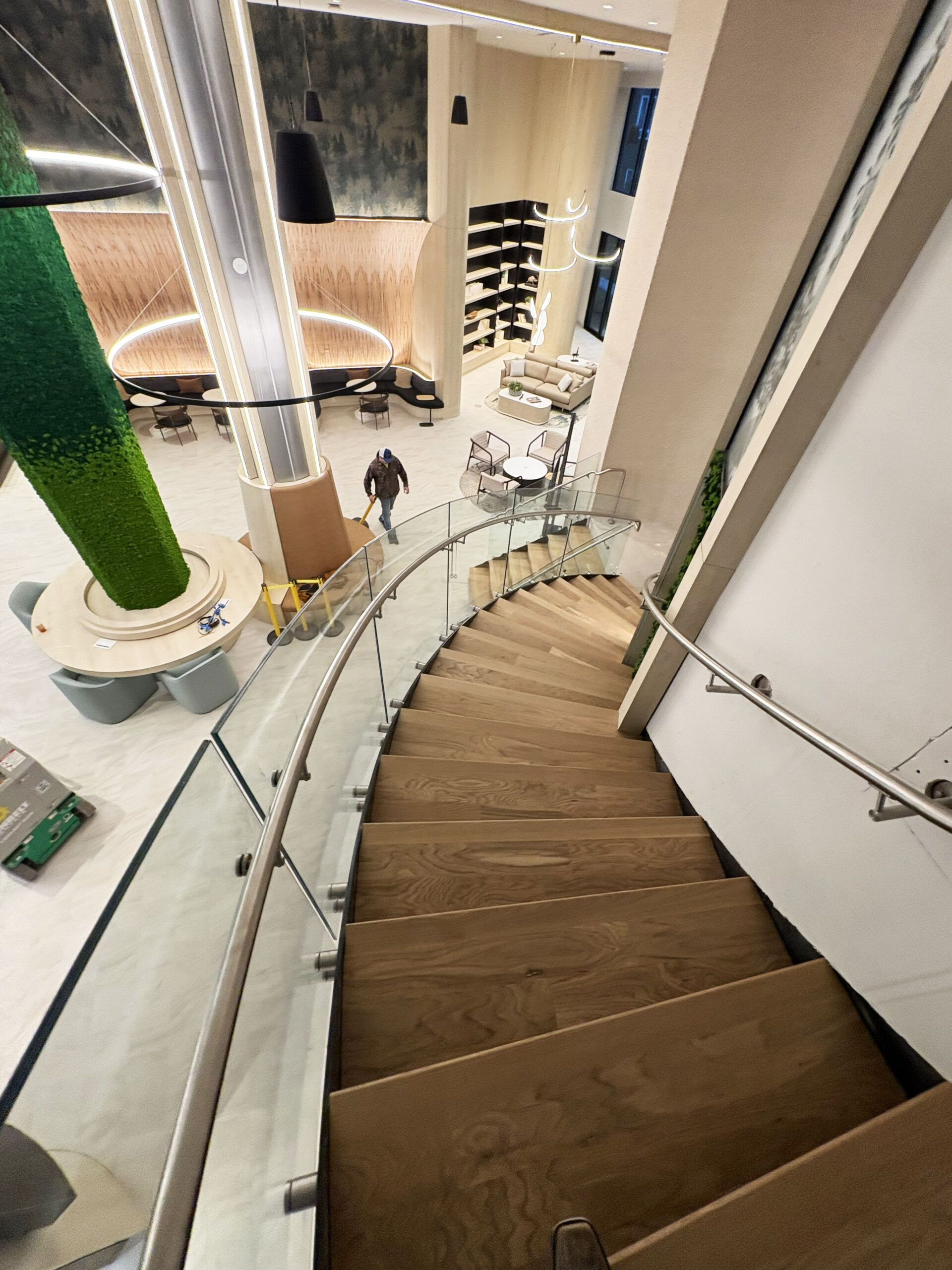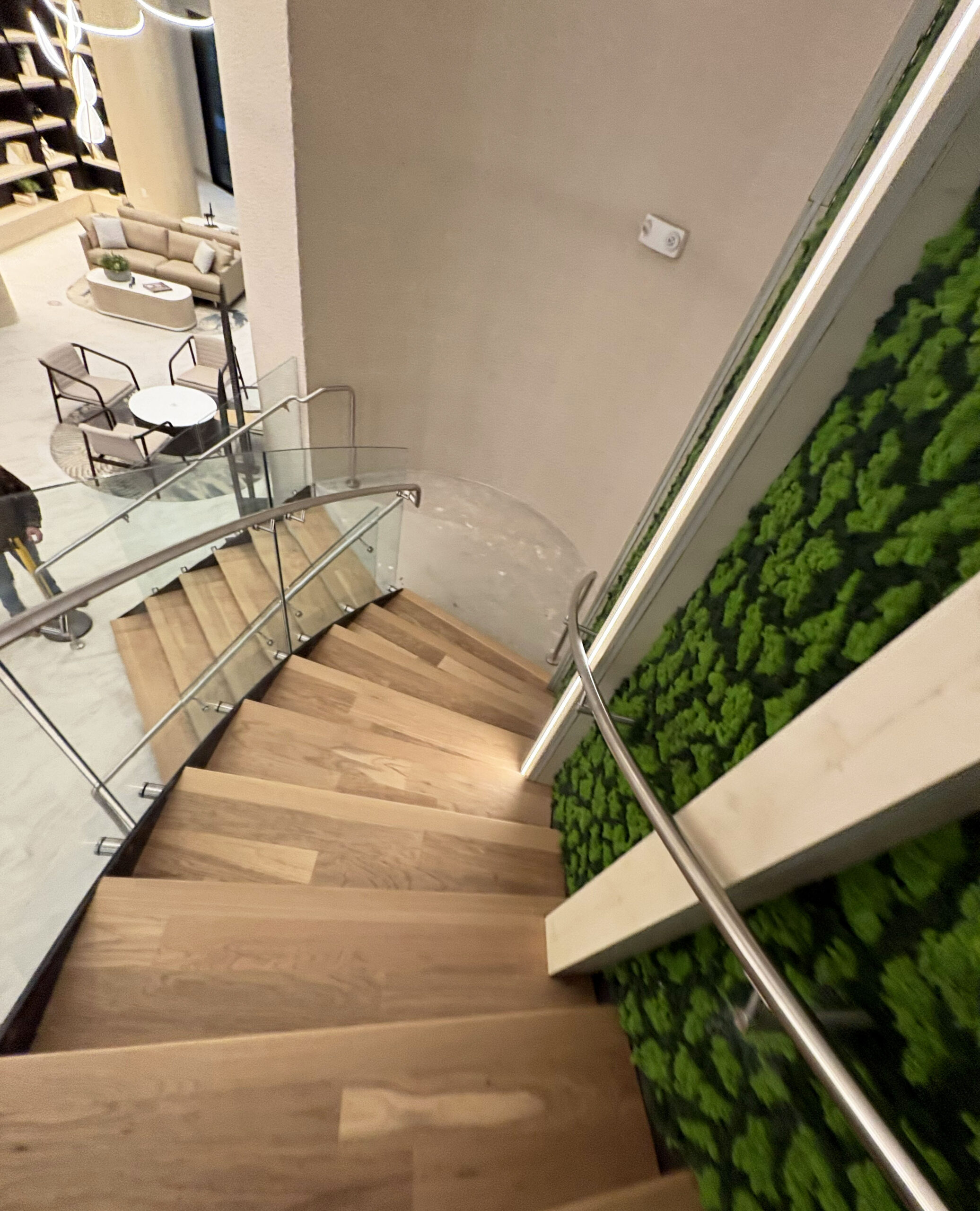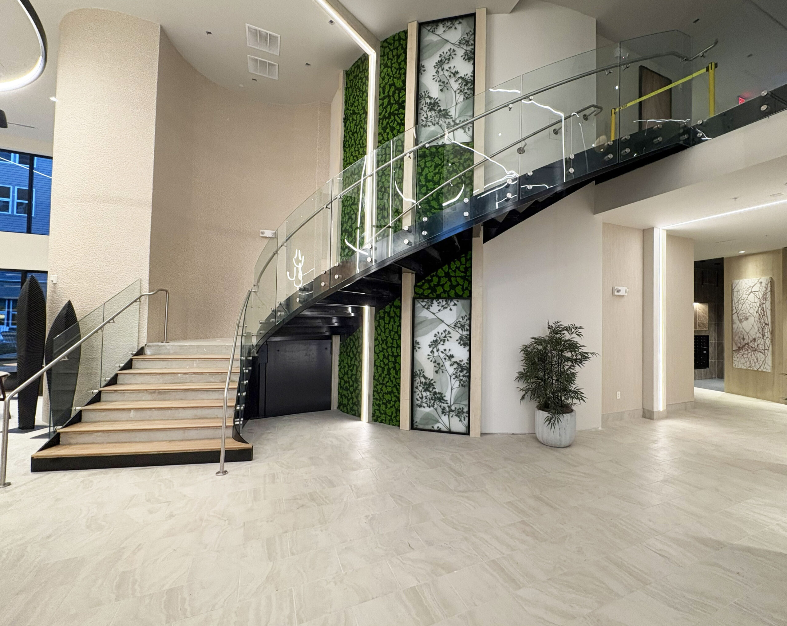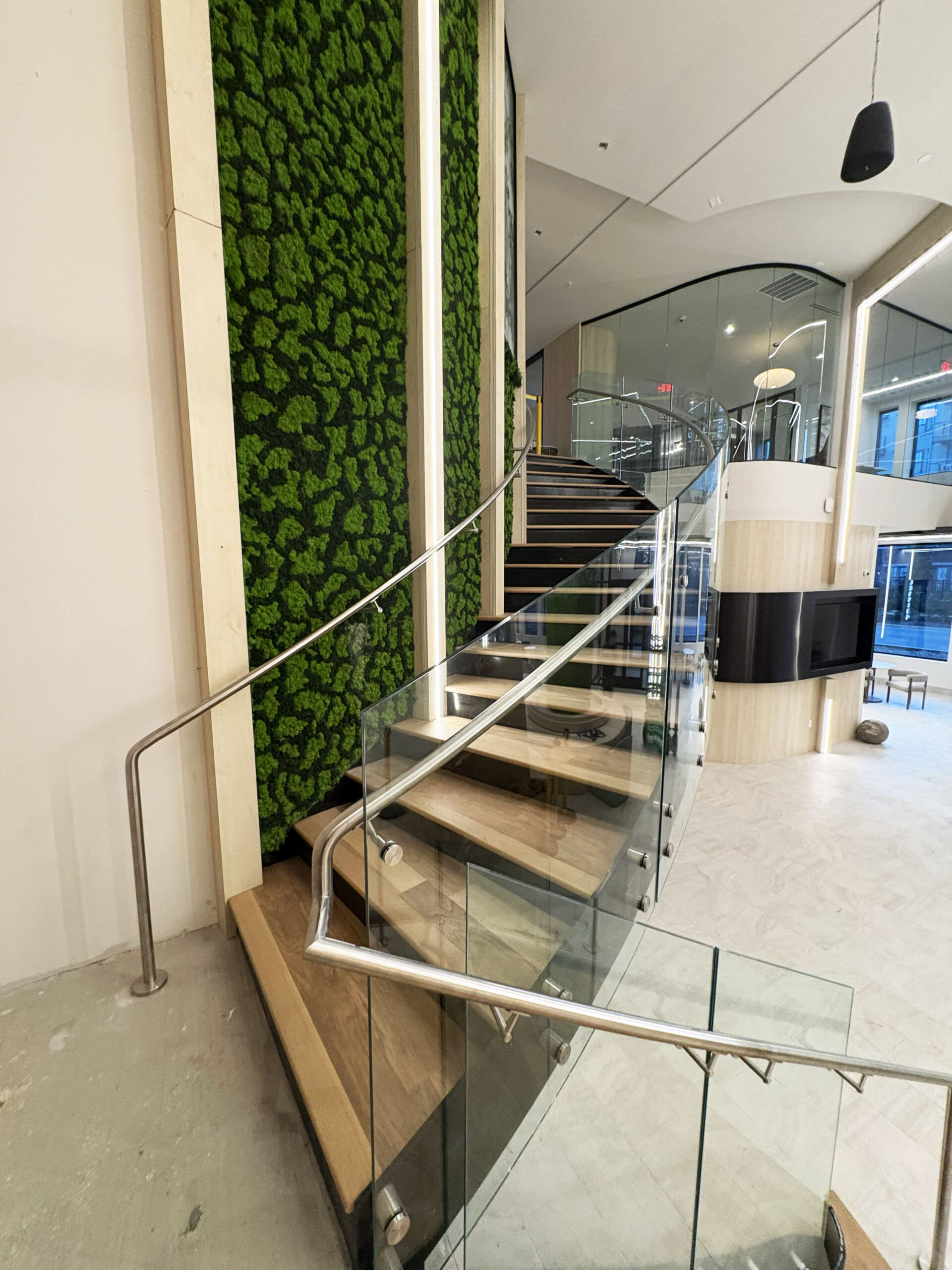 The completed installation anchors Wellory’s lobby experience. Residents and visitors encounter the curved glass staircase immediately upon entry — flanked by living moss walls and illuminated architectural panels that reinforce the building’s wellness identity.