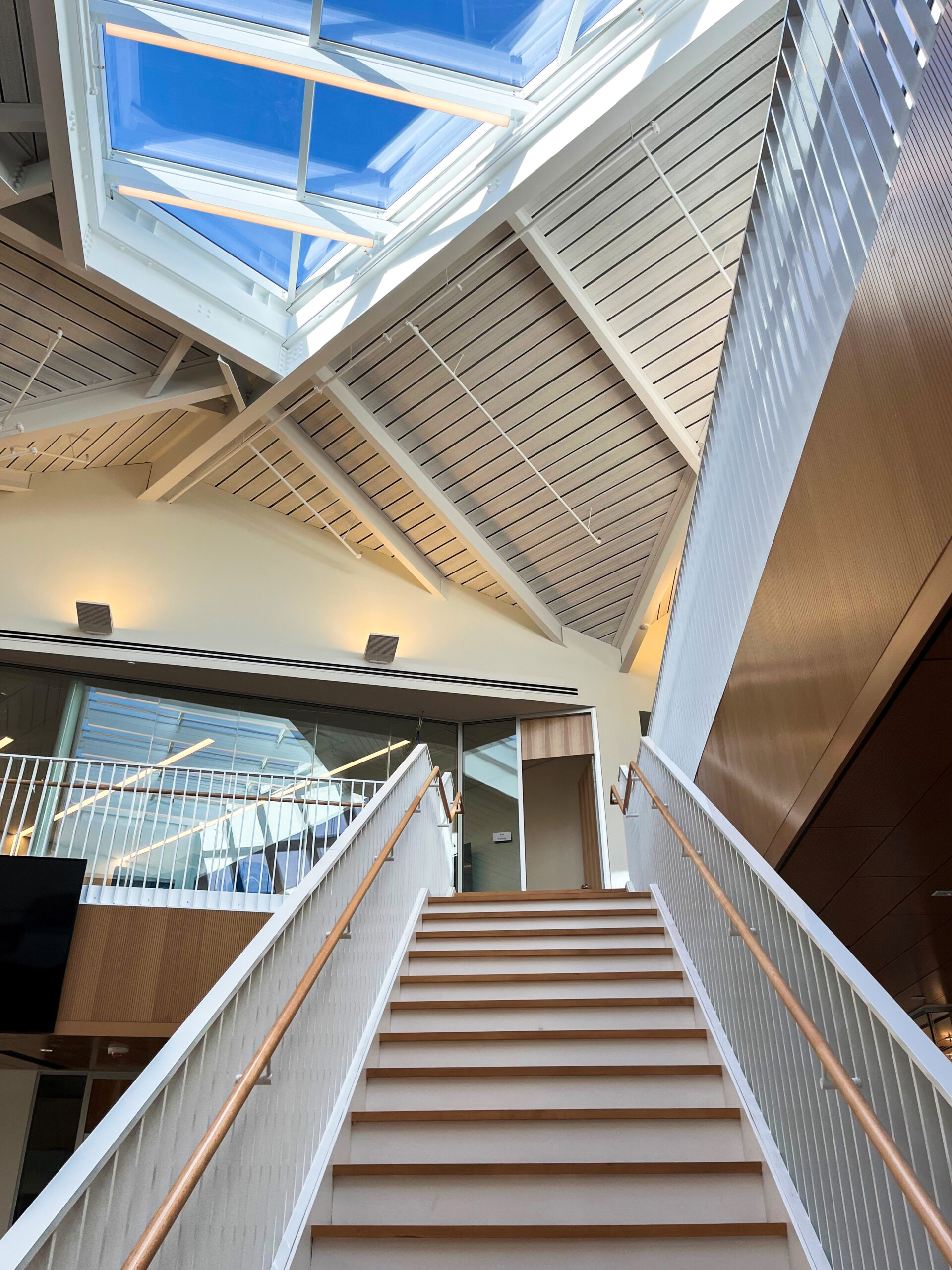 Transparency defines the building. Floor‑to‑ceiling glass walls allow students to see and join activities—from a jam session, to a robotics build, to quiet study. Inside, wood and steel elements meet glass in a bright, modern palette that encourages movement and interaction.