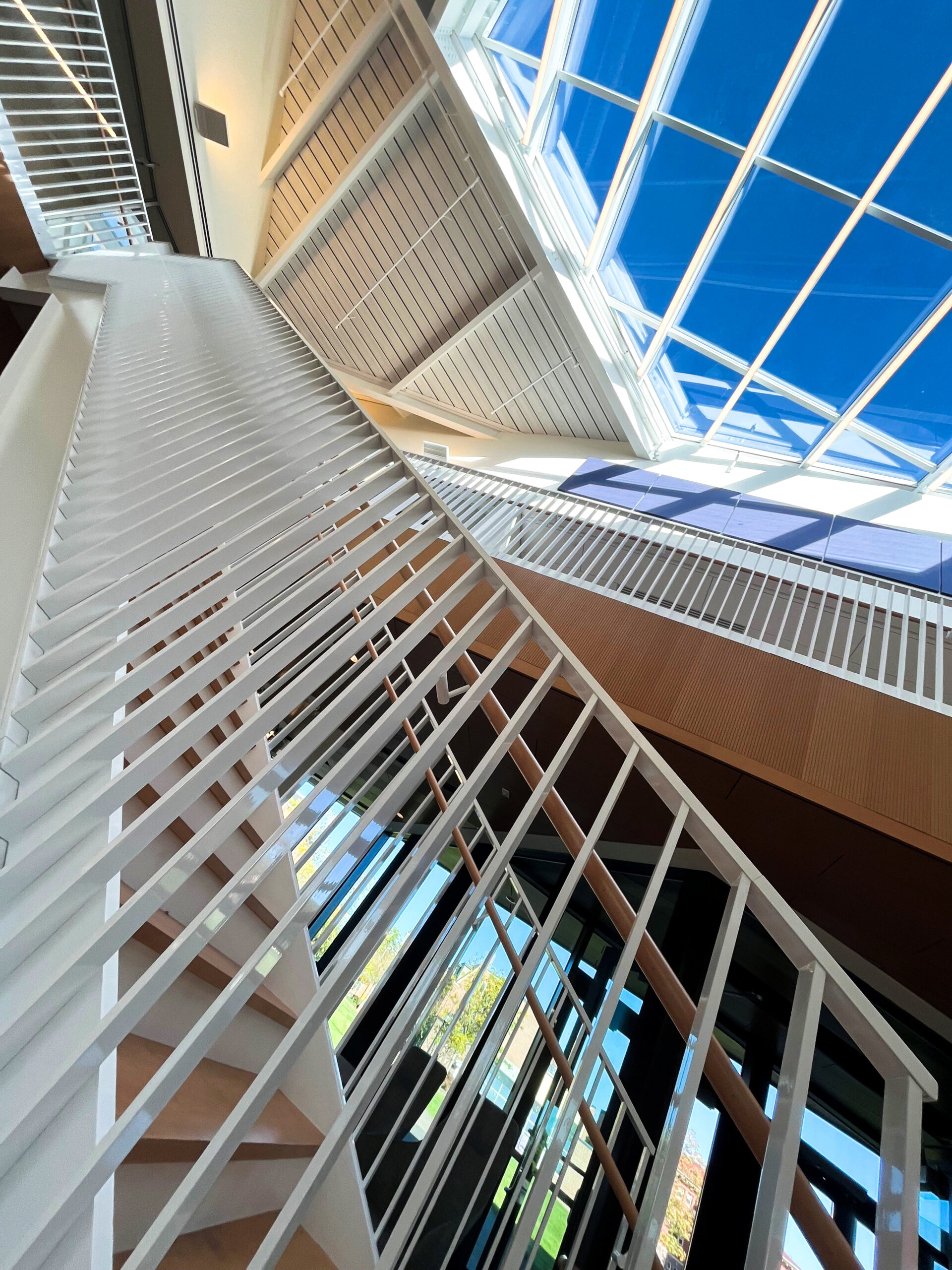 Vertical picket infill creates a crisp rhythm along overlooks and stair runs, echoing the building’s geometry while maintaining safety.